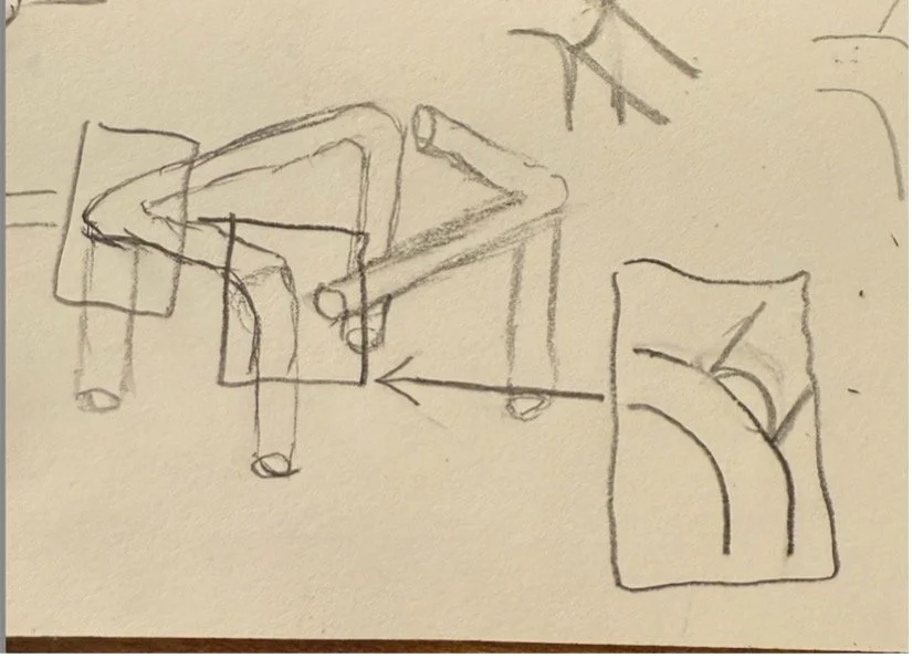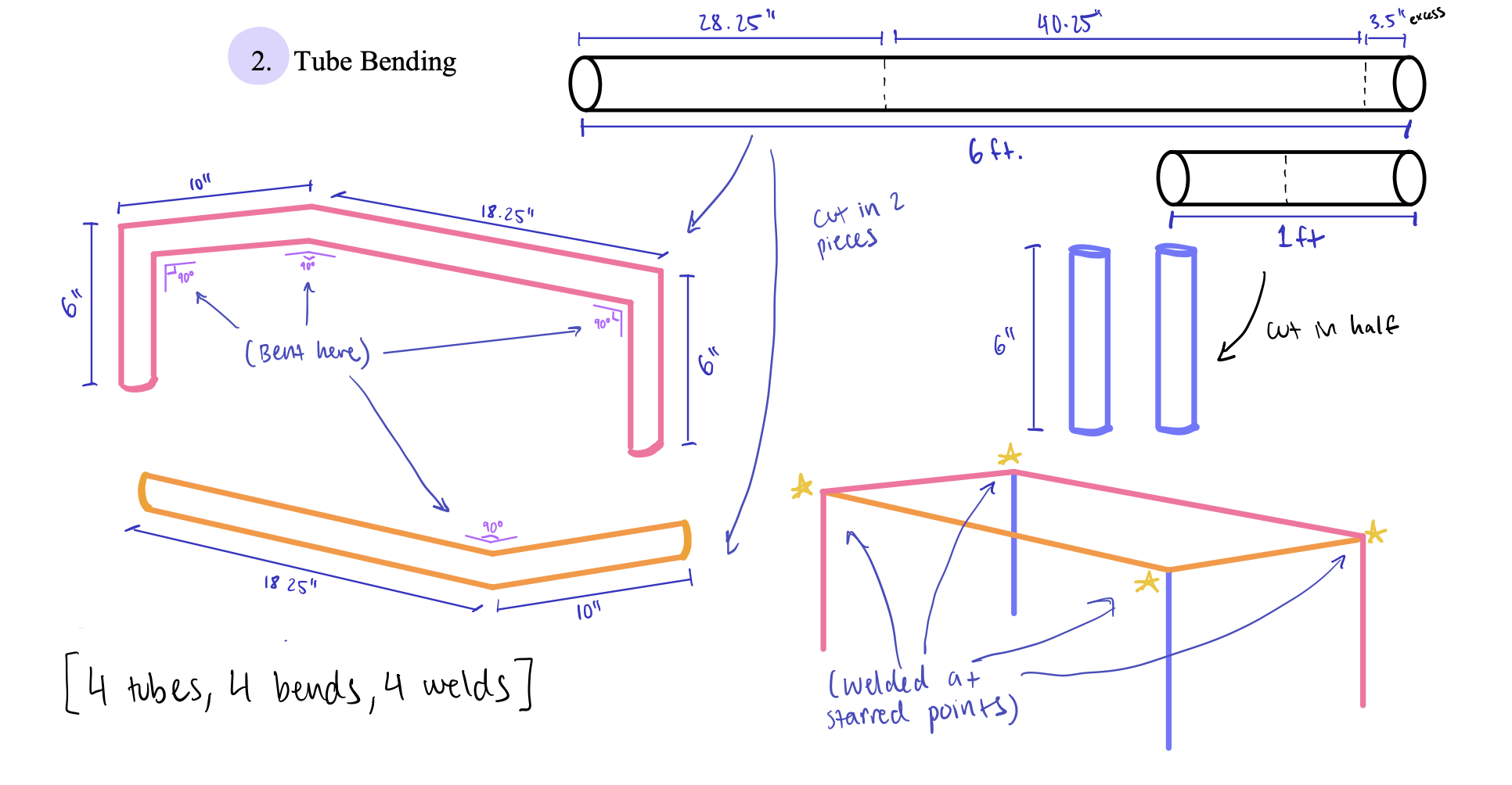 My original design sketches aimed to minimize the number of tubes required for the structure, so I planned to use 4 tubes, bent in different ways. Here are those initial sketches (color coded to represent the 4 tube sections):
