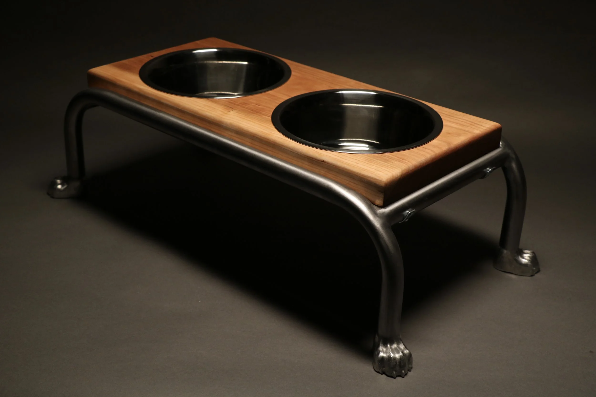 An elegant, elevated feeding station that holds my dog’s food & water bowls