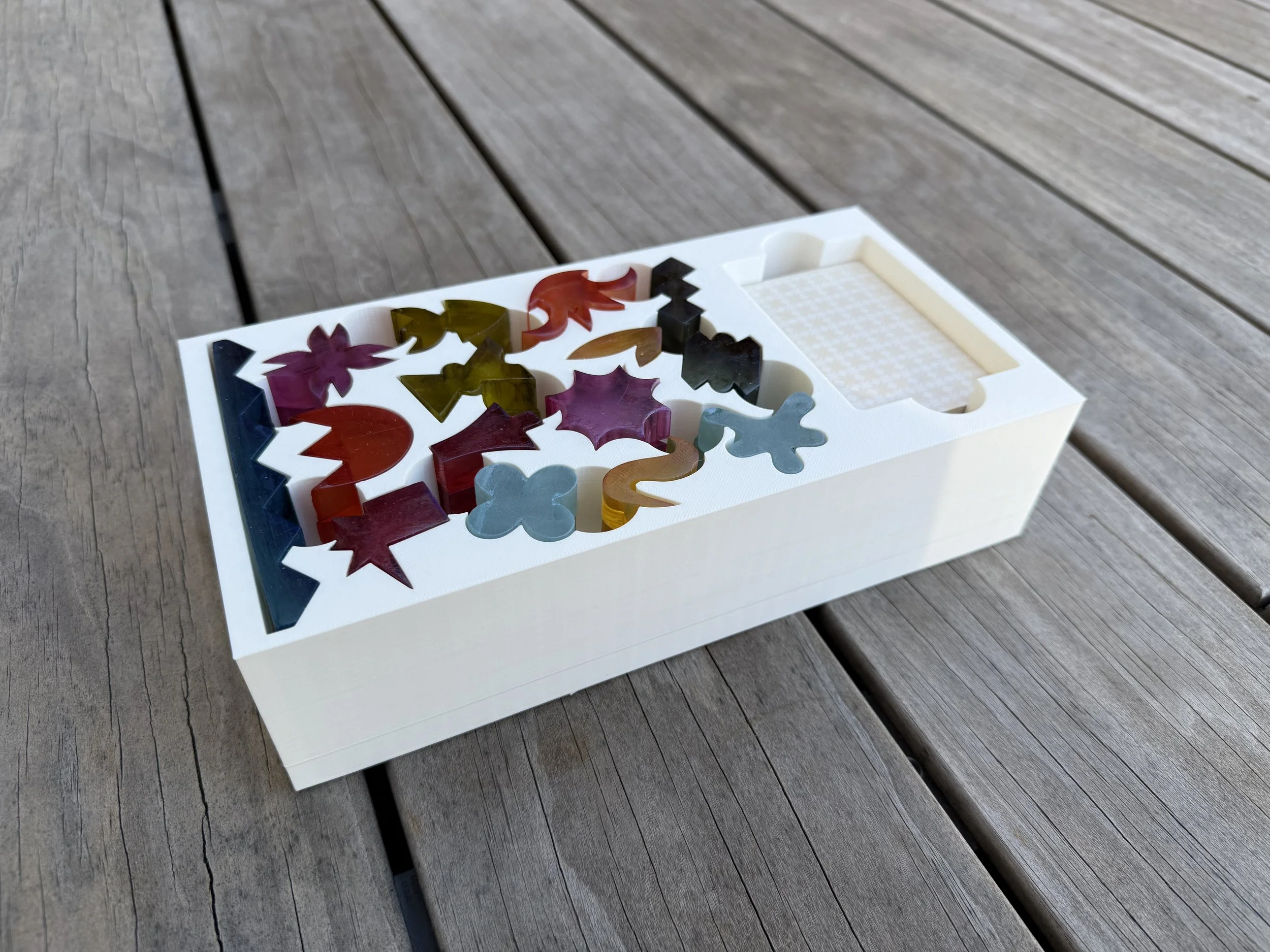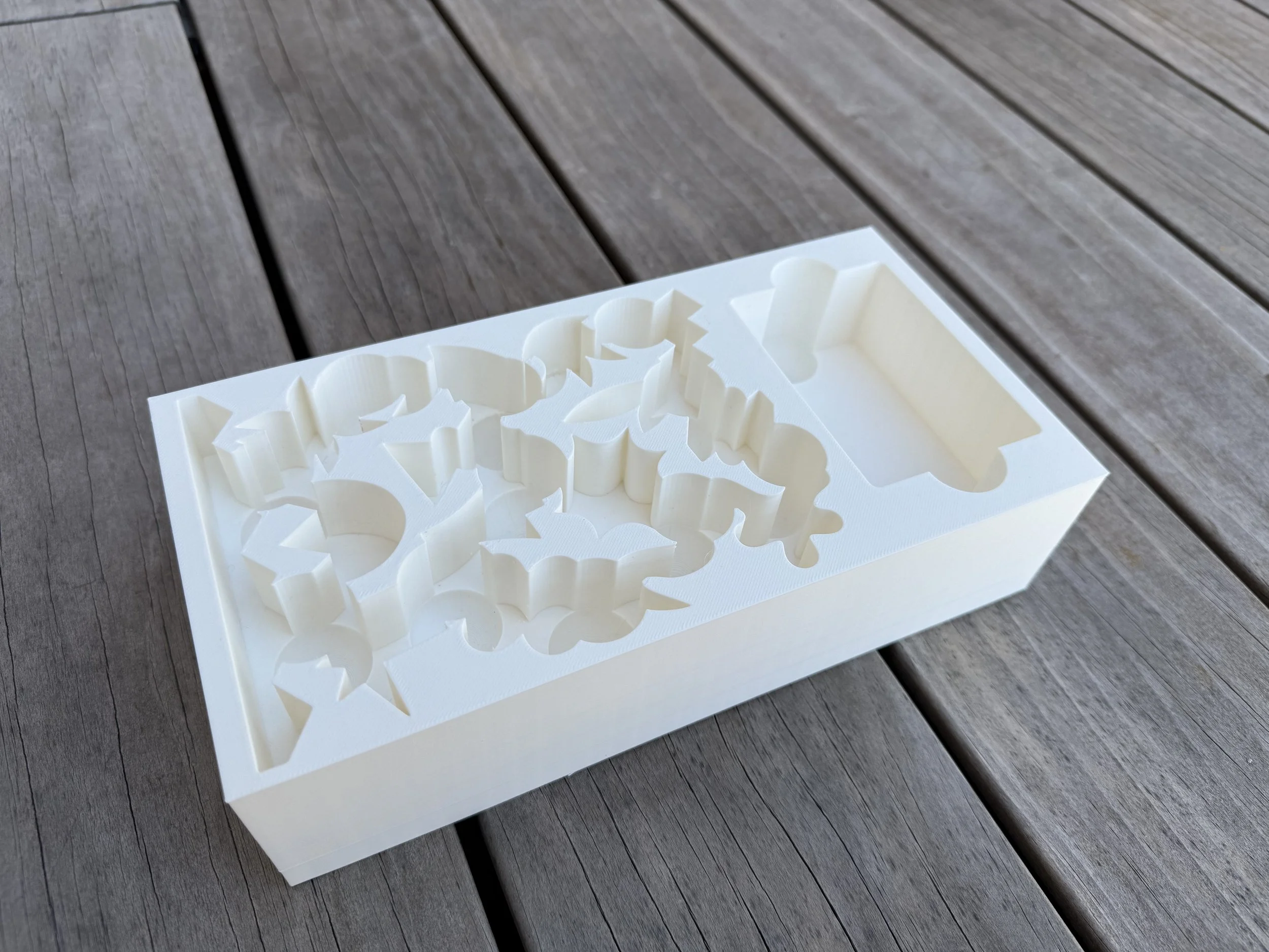 I 3D printed this prototype to test the fit in the box and the sizing for each of the holes (for pieces + cards). I made the full insert dimensions slightly smaller than the game box, and the insert holes slightly larger than the pieces + cards for an easier fit (& easier removal).