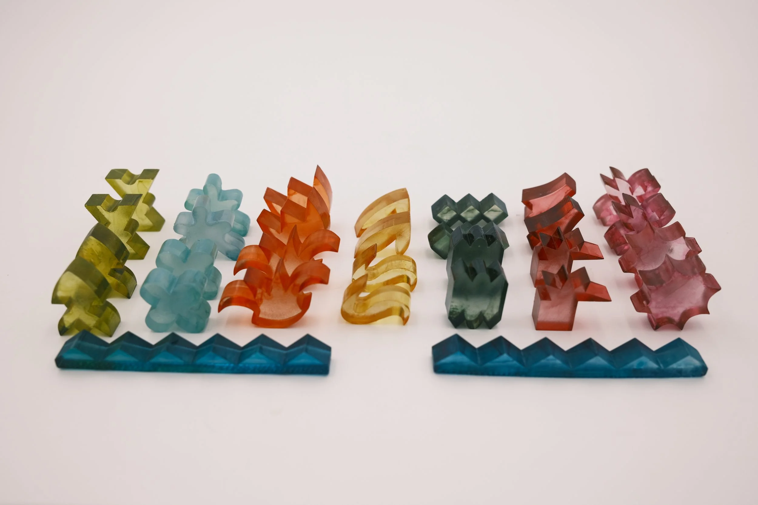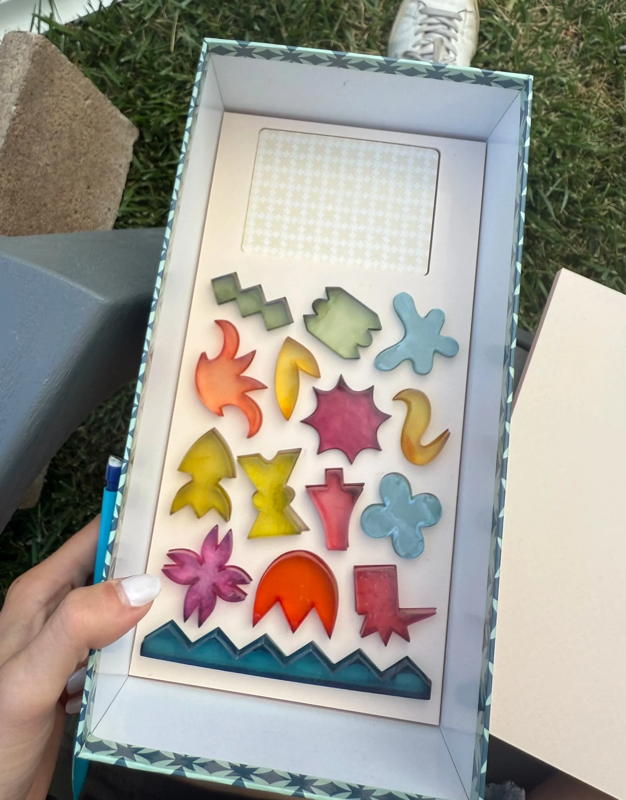 We spent months defining our brand aesthetic, designing the packaging, and physically manufacturing the game pieces by hand. We used hand-dyed resin for our blocks because it’s beautiful, and our testing found that it was the best weight for stacking.
