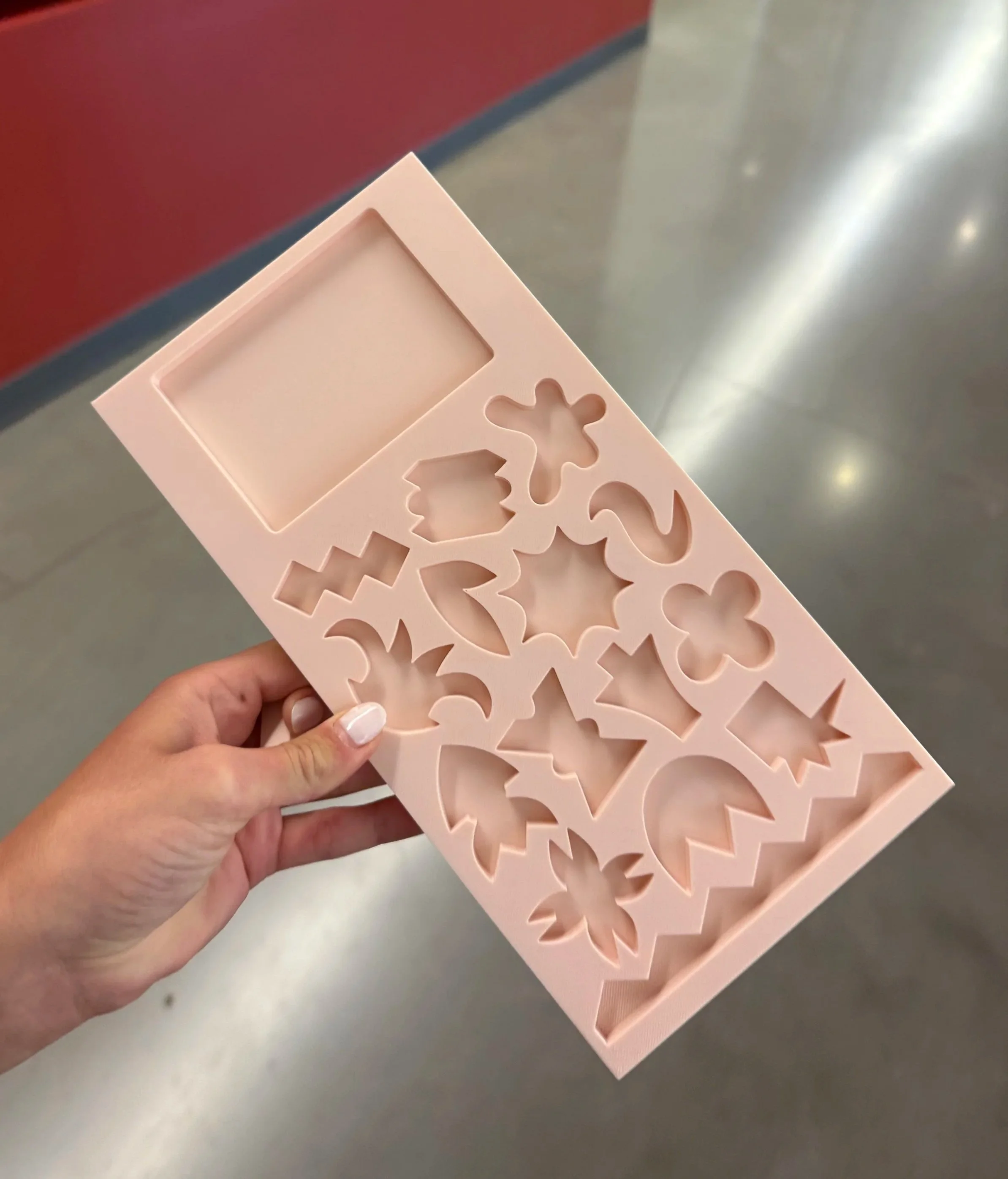 We discovered during testing that having two finger slots adjacent to each piece makes them much easier to grip and remove, so I doubled the number of finger slots in our final version. I also filleted each edge in CAD to avoid scratching the pieces or players’ fingers with sharp edges. Finally, I hollowed out the whole thing to make it lighter weight and avoid wasting PLA.