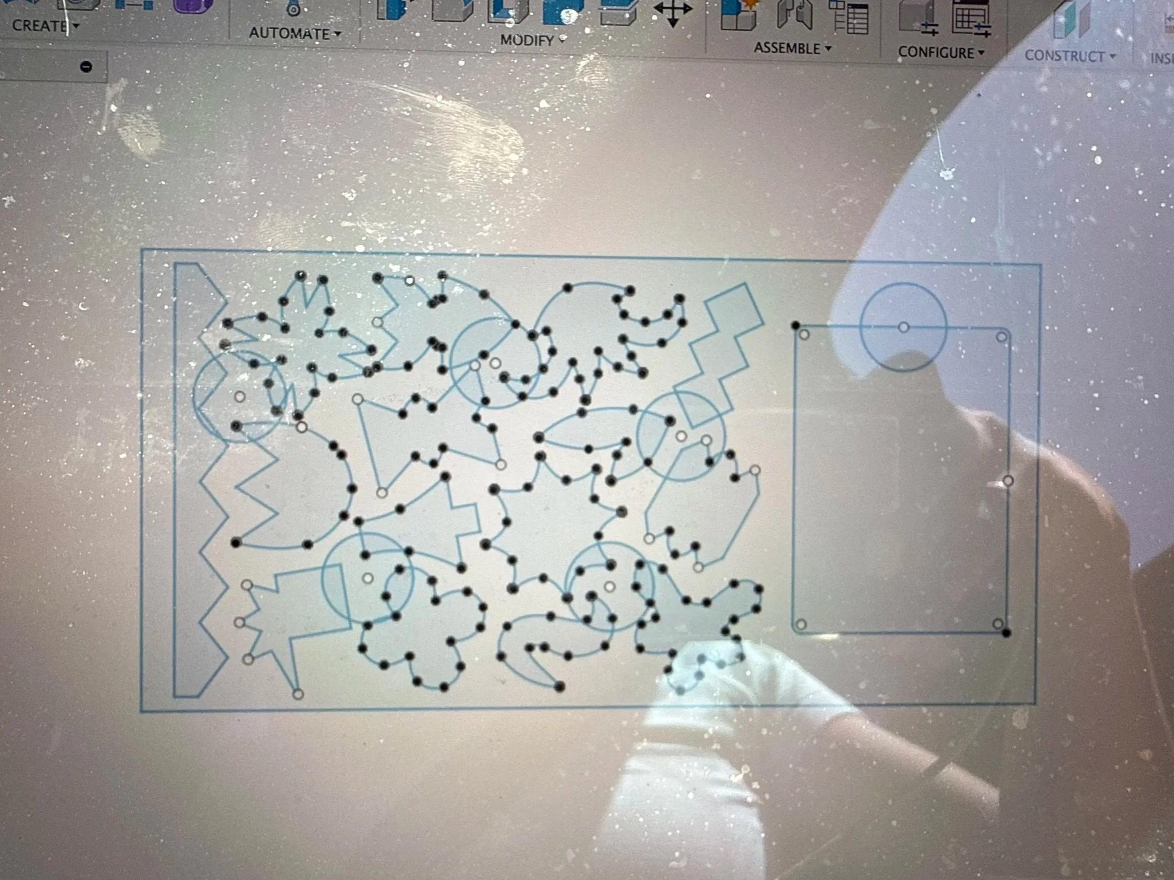Having sketched the game pieces by hand in CAD, I started with that CAD file, sketched a box the dimensions of the Playdate box around the pieces and carefully arranged them, spaced out in a natural stack form, to match our brand aesthetics. I added a rectangle for the card stack, and then extruded all my sketches to form a box with holes for the pieces + cards.